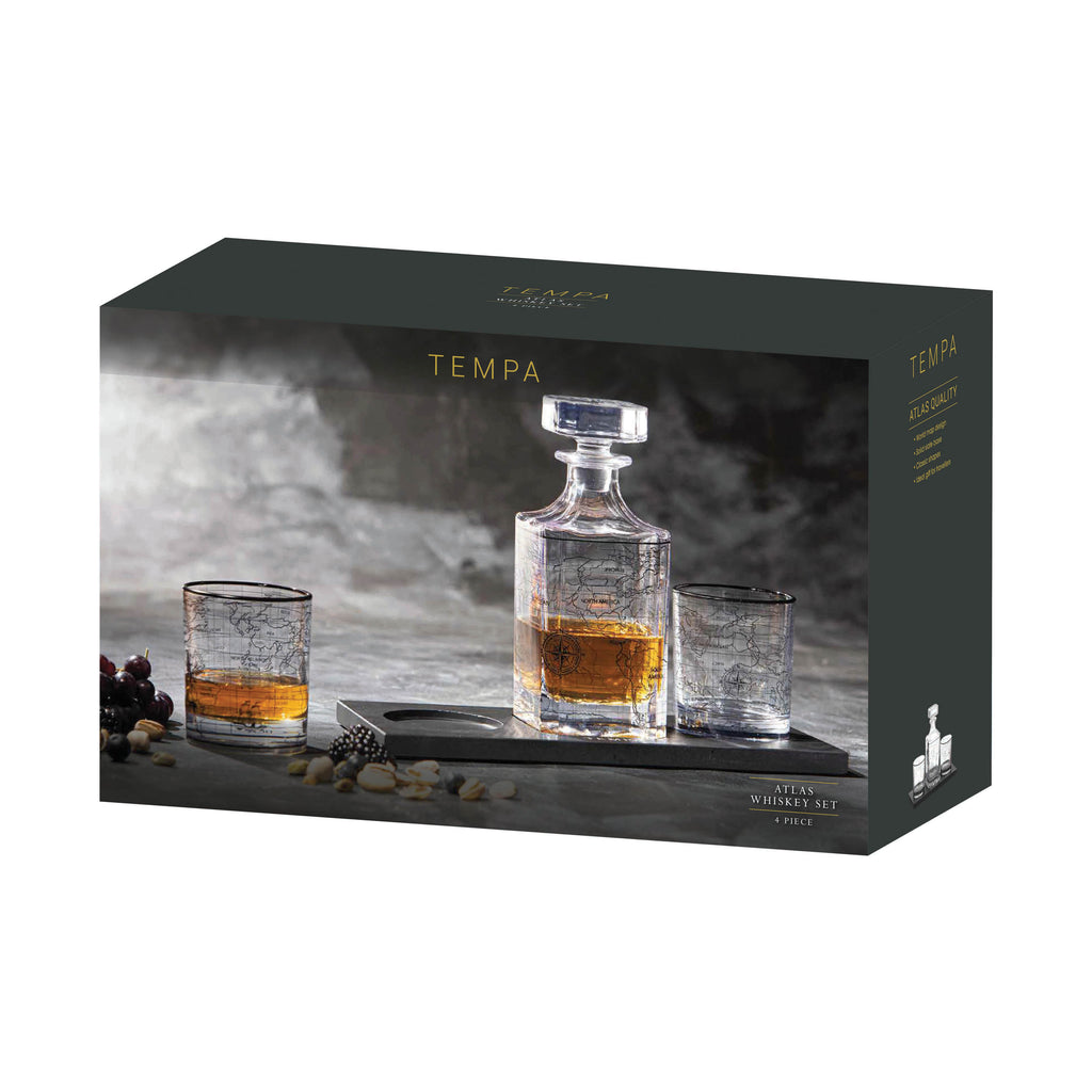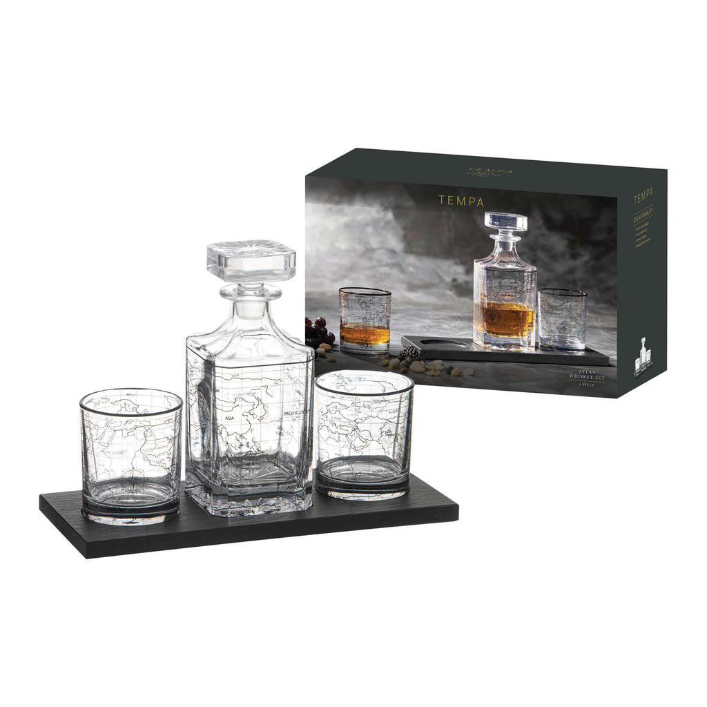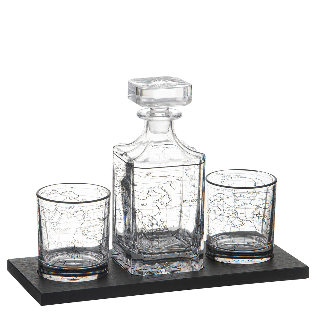 Raise a glass to adventure with Atlas. Each whisky piece features a black world map decal and rests on a sleek slate base. Available in 4pc and 6pc whisky sets with decanter, plus a 2pc glass and coaster set. A refined gift for explorers and whisky lovers alike.