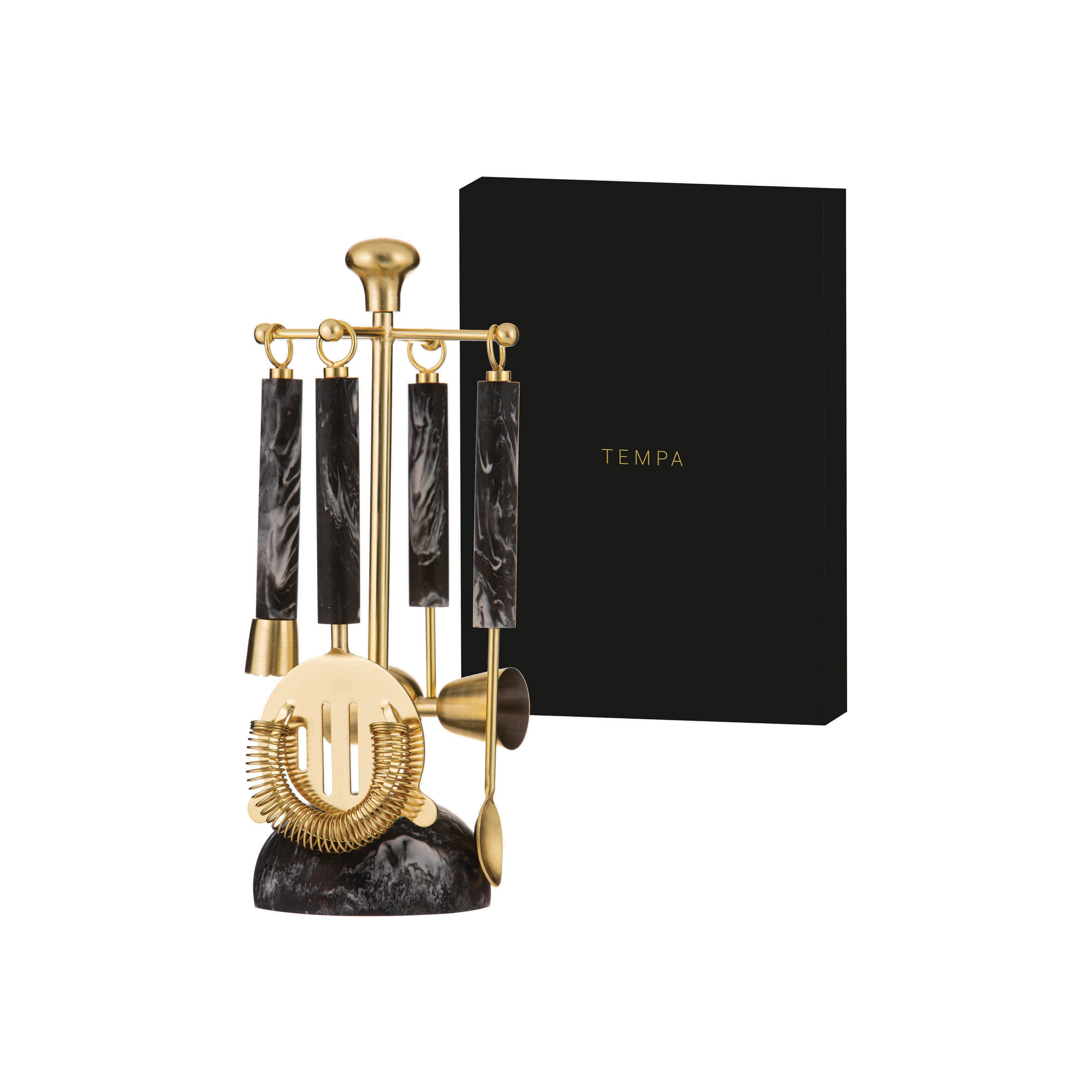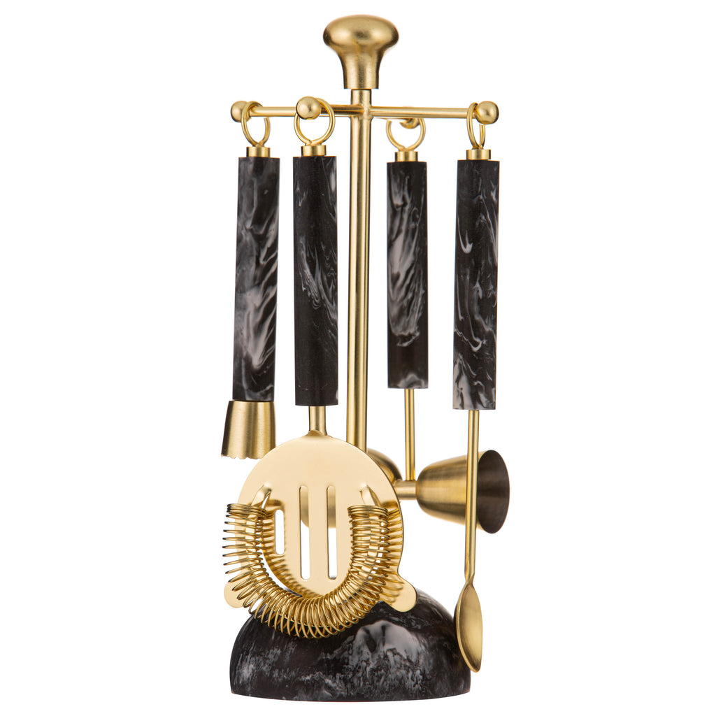 Striking coordinating range featuring separate cocktail shakers and matching 5-piece bar tool sets.