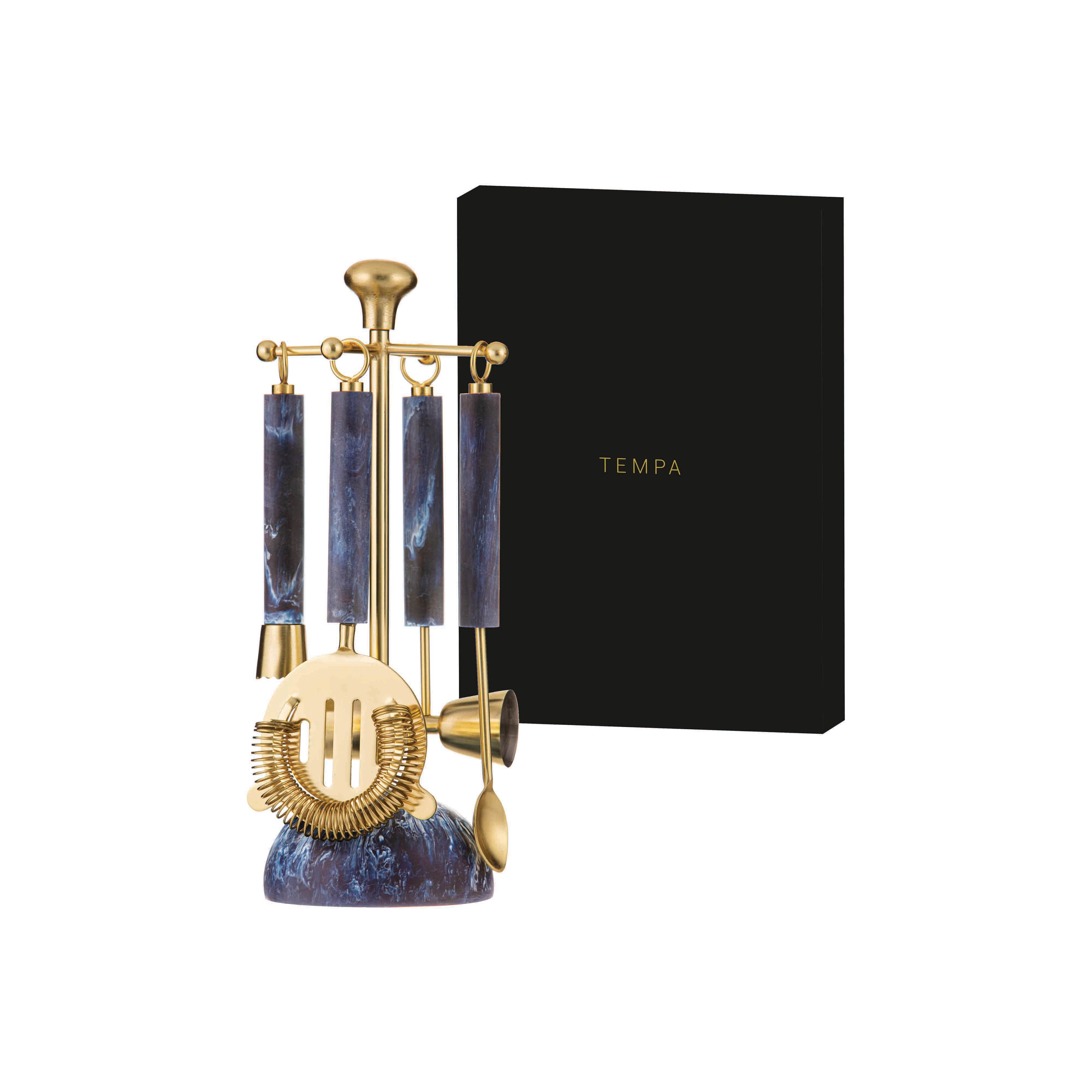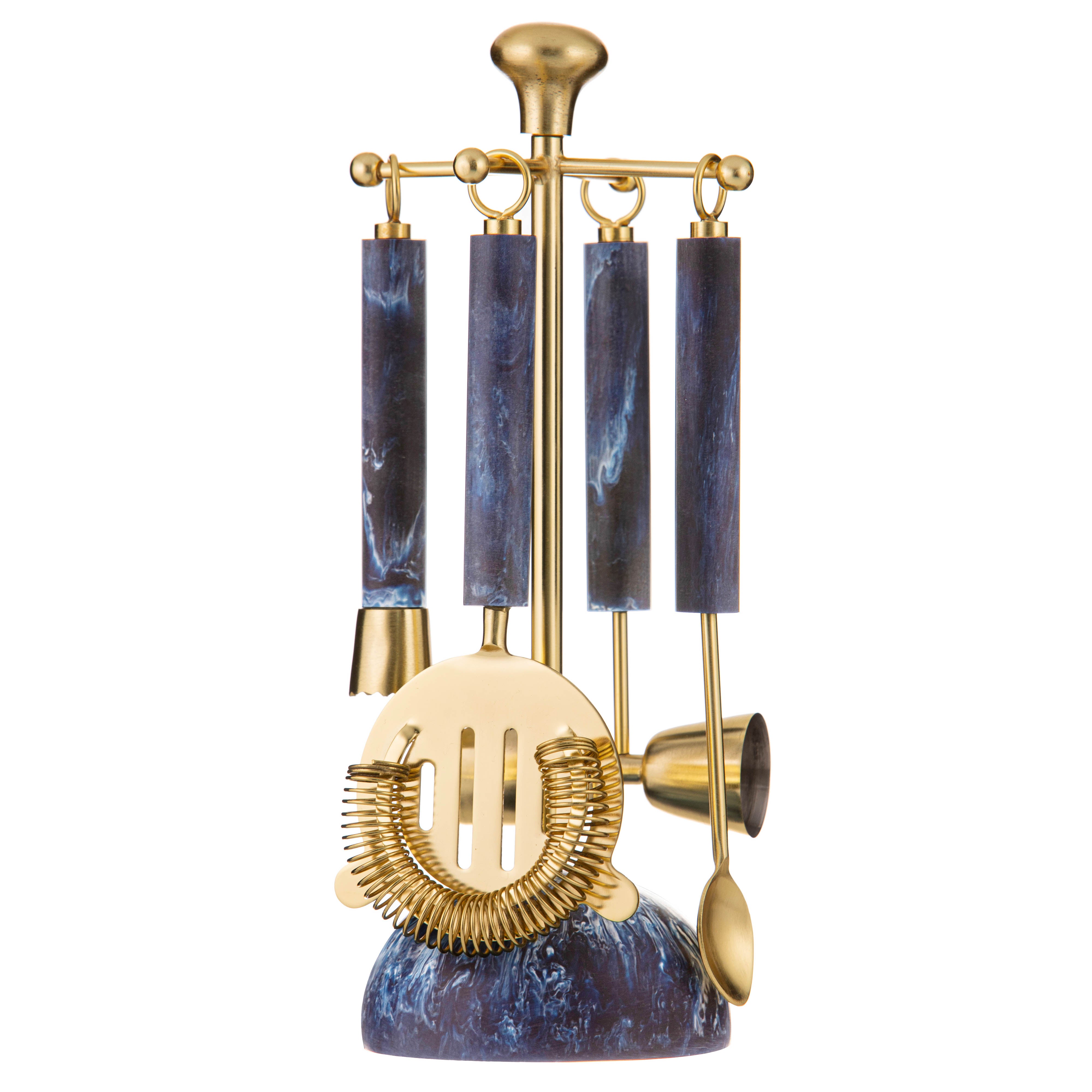 Striking coordinating range featuring separate cocktail shakers and matching 5-piece bar tool sets.