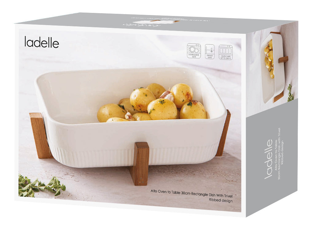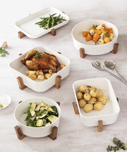 Alto Oven to Table is the perfect way to bring your culinary creations to the table with style and ease. The latest additions have a refined, rib design. When you're ready to serve, simply place the bowl on the Acacia wood trivet for a tableside presentation that is both elegant and practical.