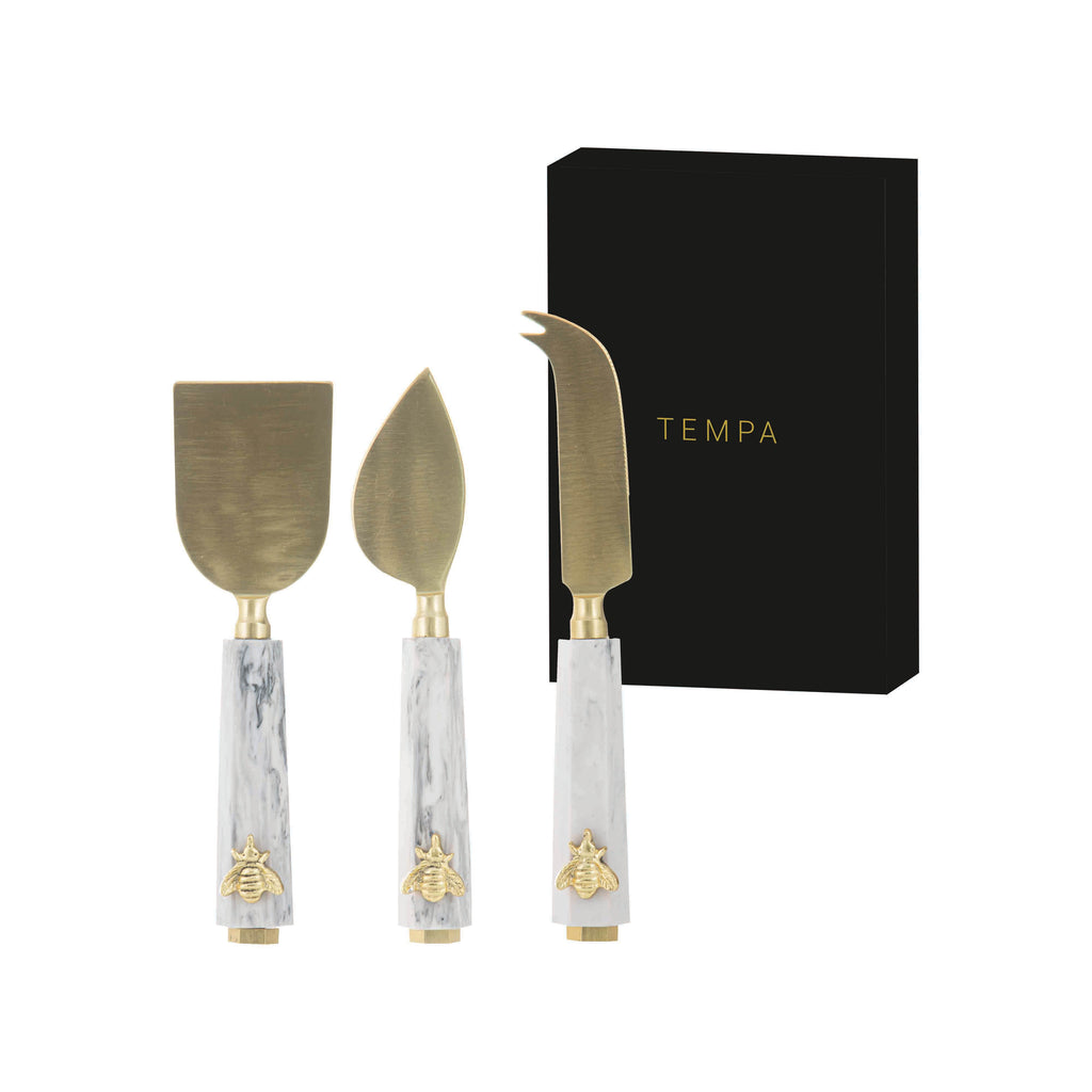 Modern Bee adds refined style to entertaining with its signature gold bee motif. Featuring a cocktail shaker, matching bar tools, cheese knives, and salad servers, this luxe collection mixes metallic finishes with marble-look handles. Beautifully gift boxed with Tempa’s gold logo.