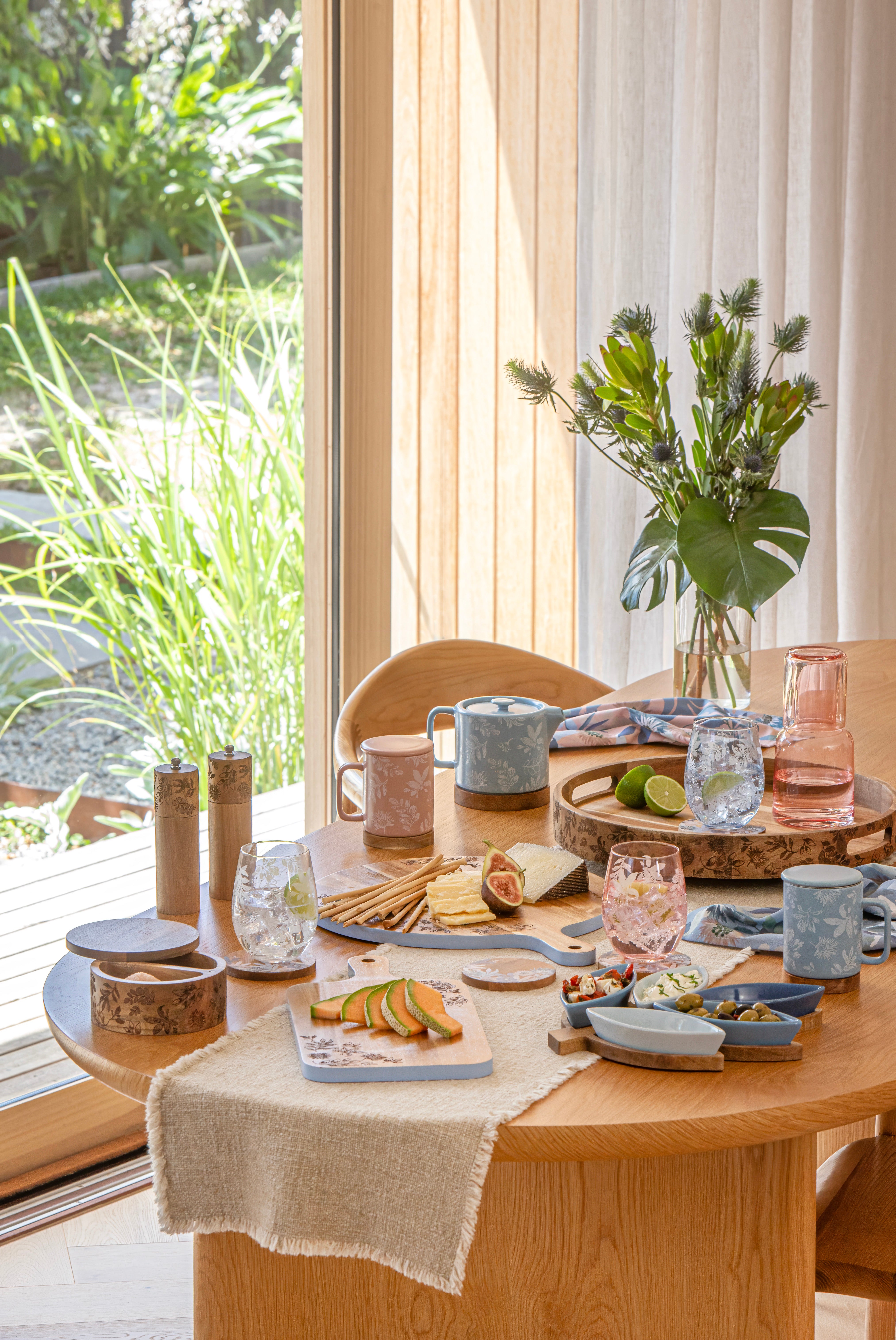 The distinctive Mossman features an exclusive in-house botanical print in blue and blush tones. Designed to mix seamlessly across the table for relaxed yet considered hosting, the range includes delicate glassware, soft-coloured teaware & textiles and etched acacia wood serveware.