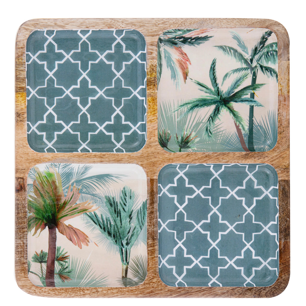The Panama range features an in-house palm print across mango wood serveware, placemats, trays, and resin-handled utensils. Scalloped resin bowls and coasters come in four coordinated colours. Perfect for mixing, matching, and adding a tropical feel to your table or bar setup.